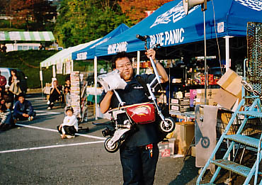 | 恒例のラッフルで、ミニモンキーをGETして満弁の笑顔!! | こちらもラッフルで16"折りたたみ自転車をGET!! | |